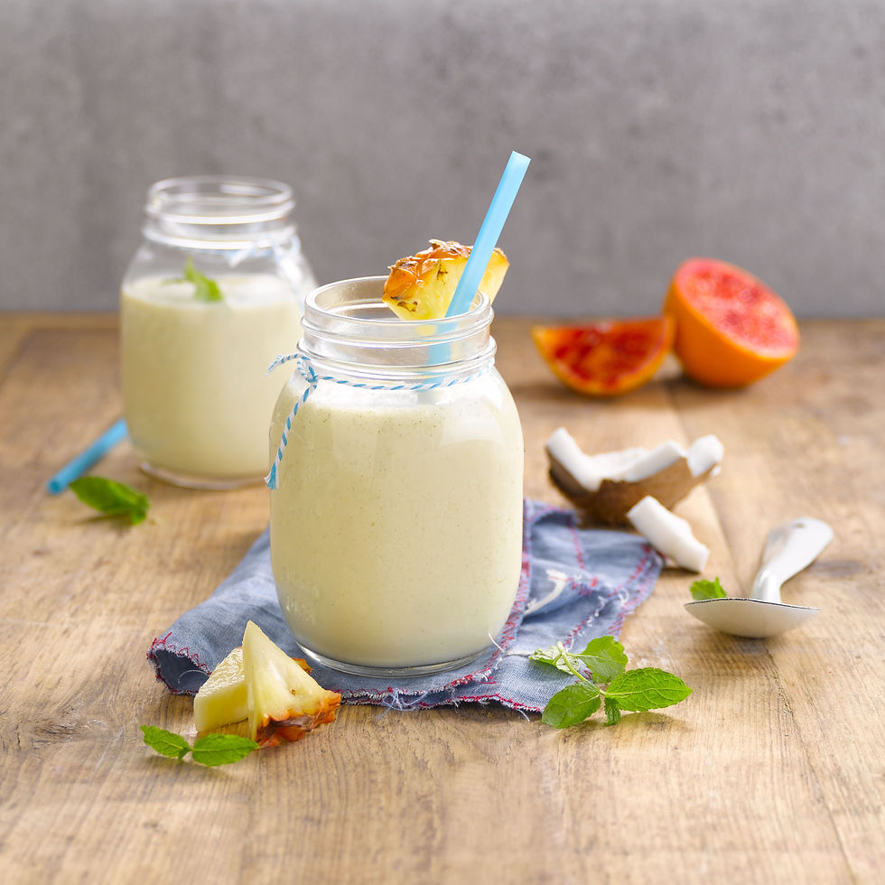 Put the fruit and mint leaves into the blender and add the Alpro Plain with Coconut